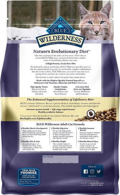 - Blue Buffalo Wilderness Chicken Recipe Grain-Free Dry Cat Food contains omega-3 and 6 fatty acids to support your fur-iend’s healthy skin and coat health.