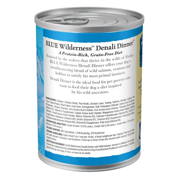 - Blue Buffalo Wilderness Denali Dinner with Wild Salmon, Venison & Halibut Grain-Free Canned Dog Food, 12.5-oz, case of 12—Serve as a special treat, mixed with dry food or all on its own as an entree.