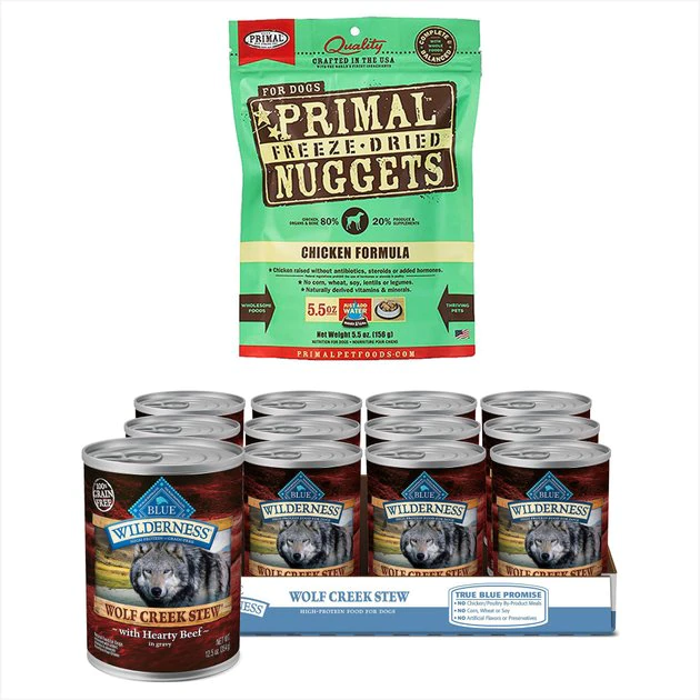 - Blue Buffalo Wilderness Wolf Creek Stew Hearty Beef Stew Grain-Free Adult Canned Dog Food, 12.5-oz, case of 12—Starts with real beef to keep your buddy feeling active and energetic.