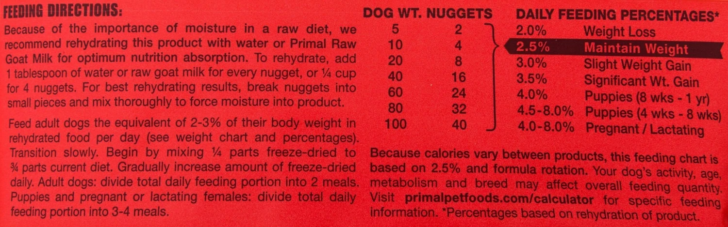 - Primal Chicken Formula Nuggets Grain-Free Raw Freeze-Dried Dog Food, 5.5-oz bag—Made with antibiotic, hormone and steroid-free chicken meat and organs, along with fresh ground bone for calcium supplementation.