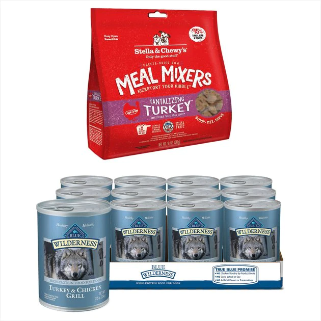 - Blue Buffalo Wilderness Turkey & Chicken Grill Grain-Free Canned Dog Food, 12.5-oz, case of 12—Serve as a special treat, mixed with dry food or all on its own as an entree.