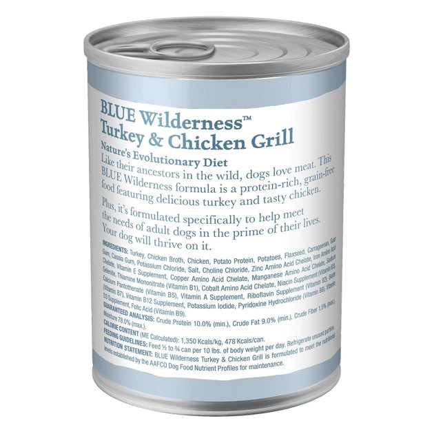 - Blue Buffalo Wilderness Turkey & Chicken Grill Grain-Free Canned Dog Food, 12.5-oz, case of 12—Formulated to promote healthy muscle growth.