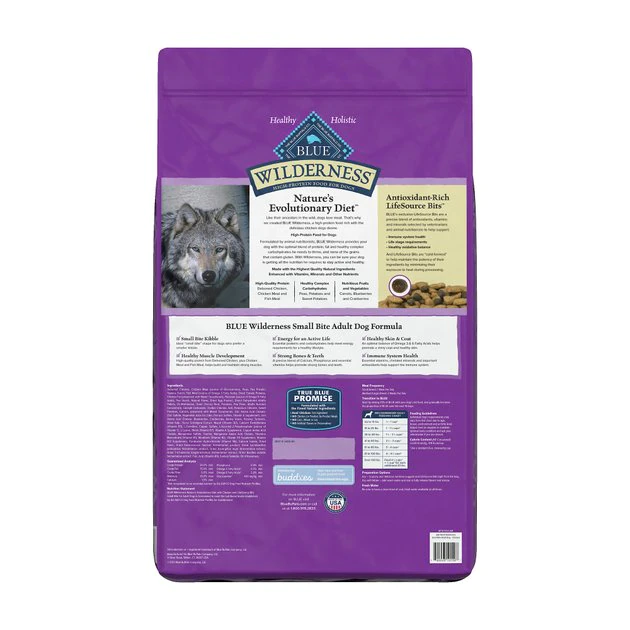Even your small pal is descended from mighty wolves—feed his wilder side with Blue Buffalo Wilderness High Protein Grain Free, Natural Adult Small-Bite Dry. Dog Food, Chicken. This protein-rich formula features real, delicious chicken—a quality protein to satisfy your buddy’s love of meat and encourage him to maintain lean muscles. It contains a precise blend of vitamins, minerals and antioxidants to support your pup’s immune system as well as omega 3 and 6 fatty acids to promote a healthy coat and skin. It’s made without the use of grains, corn, wheat, soy or meat by-products. And as a bonus—it comes in bite-sized kibbles that are easier for your tiny-but-mighty pupper to eat!