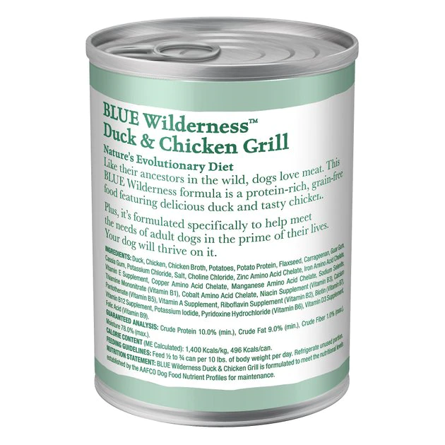 Power your pupper pal with the poultry protein in Blue Buffalo Wilderness High Protein Grain Free, Natural Adult Wet Dog Food. Paw-fect for your grown-up guy, this irresistibly tasty wet food is made using only the finest naturally grain and gluten-free ingredients. It starts with high-quality protein from grilled pieces of duck and chicken, packed with fruits and veggies, then enhanced with vitamins and minerals. Formulated to promote an active lifestyle and healthy muscle growth, this high-protein dog food is made with wholesome ingredients that do not contain any grain, gluten, by-product meals, corn, wheat, soy, artificial flavors or preservatives.