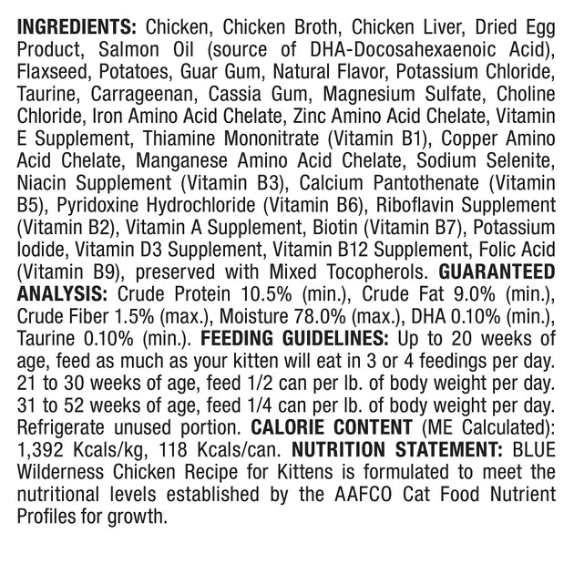 Stock up on supper for your sidekick with Blue Buffalo Wilderness High Protein Grain Free, Natural Kitten Pate Wet Cat Food. Purr-fect for your growing kitten, this irresistibly tasty wet food is made using only the finest naturally grain and gluten-free ingredients. It starts with high-protein chicken, packed with healthy fruits and veggies, then enhanced with vitamins and minerals. Formulated with DHA, an important fatty acid found in mother’s milk, this delicious pate-style food helps support your kitty companion’s brain, eye and cognitive development. The exclusively wholesome ingredients do not contain any grain, gluten, by-product meals, corn, wheat, soy, artificial flavors or preservatives.
