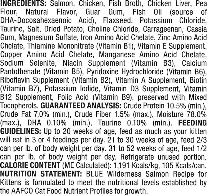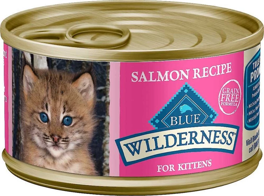 - Each purchase comes with Blue Buffalo Wilderness Kitten Salmon Grain-Free Canned Cat Food, 3-oz, case of 24 & Blue Buffalo Wilderness Kitten Chicken Recipe Grain-Free Dry Cat Food, 5-lb bag.