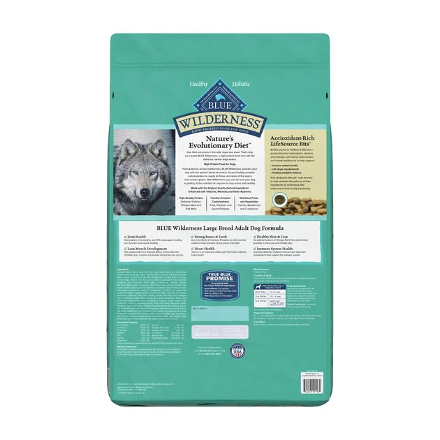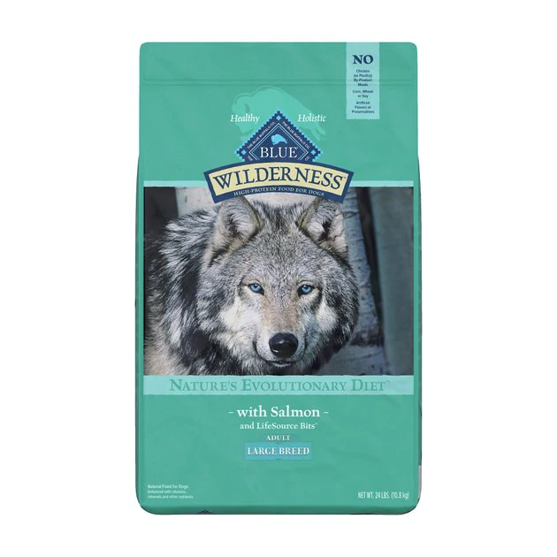 Your best pal is larger than life—feed her wild spirit with Blue Buffalo Wilderness High Protein Grain Free, Natural Adult Large Breed Dry Dog Food, Salmon. This protein-rich formula has been specifically designed for the needs of large-breed pups. It features real salmon to help your buddy build and maintain lean muscles along with ingredients like glucosamine and chondroitin to support her joint health. It contains a precise blend of antioxidants, vitamins and minerals to support a healthy immune system along with omega 3 and 6 fatty acids for healthy skin and coats. It’s also made without the use of corn, wheat, soy or meat by-products—just the real, high-quality meat that your sweet sidekick craves!