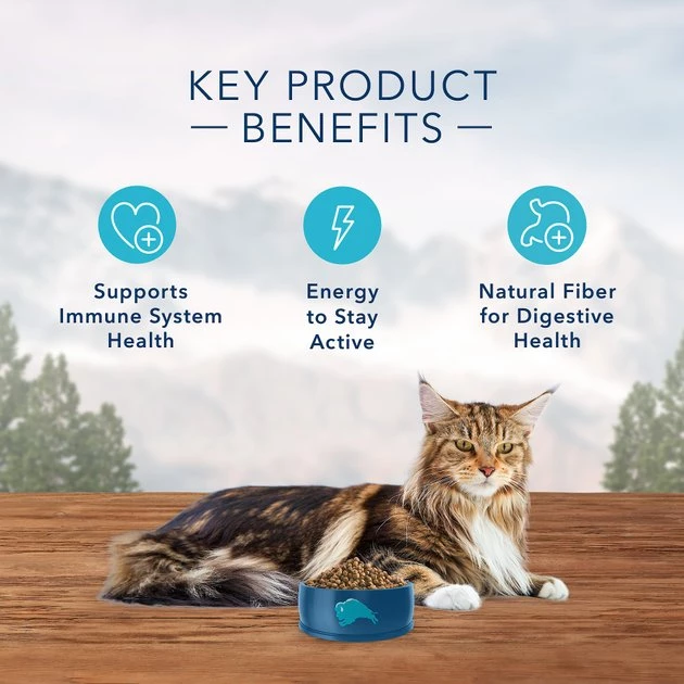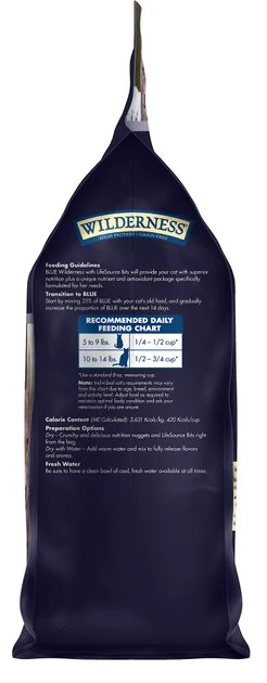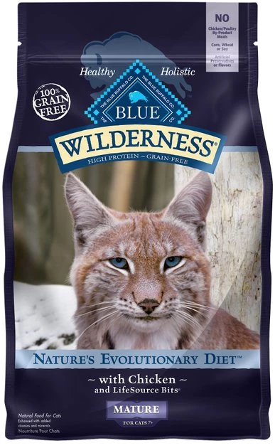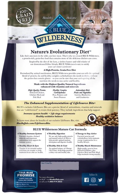 Feed your wise kitty’s wild side with the evolutionary nutrition of the Blue Buffalo Wilderness Mature Chicken Recipe Grain-Free Dry Cat Food. Made with real chicken as the first ingredient and never any grains, gluten, wheat or by-products, it packs a powerful protein punch to support your little hunter’s wild pursuits in every bowl. It’s loaded with antioxidant-rich LifeSource Bits―a unique blend of vitamins, minerals and superfoods to support immunity―plus omegas for a healthy skin and coat, taurine for vision and heart health, and essential amino acids to fuel all those indoor adventures. Plus, it helps maintain healthy digestion and happy tummies with a unique fiber blend in every bite.