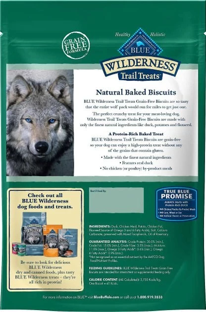 - Blue Buffalo Wilderness Trail Treats Grain-Free Duck Biscuits Dog Treats are made with Omega 3 and 6 fatty acids plus antioxidants.