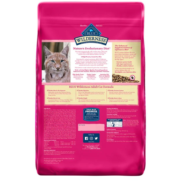 Bring out your kitty’s inner fishing-feline with a meal of Blue Buffalo Wilderness High Protein Grain Free, Natural Adult Dry Cat Food, Salmon. This grain-free food is packed with the essentials your tiny hunter needs to stay healthy and active—including high-protein salmon meat to help him build strong and lean muscles. It contains a carefully formulated blend of antioxidants, vitamins and minerals to support a healthy immune system along with omega 3 and 6 fatty acids for purr-fectly healthy skin and coats. It’s also full of good-for-you carbohydrates like sweet potato and peas and is made without the use of corn, wheat, soy or meat by-products. It’s a crave-worthy way to support your favorite feline’s health and well being—whether he’s a snuggle bug or a true wild child!