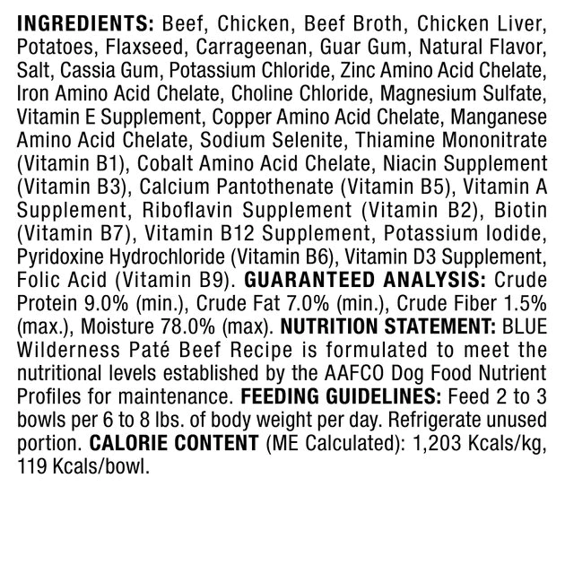 Beef, Chicken, Beef Broth, Chicken Liver, Potatoes, Flaxseed, Carrageenan, Guar Gum, Natural Flavor, Salt, Cassia Gum, Potassium Chloride, Zinc Amino Acid Chelate, Iron Amino Acid Chelate, Choline Chloride, Magnesium Sulfate, Vitamin E Supplement, Copper Amino Acid Chelate, Manganese Amino Acid Chelate, Sodium Selenite, Thiamine Mononitrate (Vitamin B1), Cobalt Amino Acid Chelate, Niacin Supplement (Vitamin B3), Calcium Pantothenate (Vitamin B5), Vitamin A Supplement, Riboflavin Supplement (Vitamin B2), Biotin (Vitamin B7), Vitamin B12 Supplement, Potassium Iodide, Pyridoxine Hydrochloride (Vitamin B6), Vitamin D3 Supplement, Folic Acid (Vitamin B9).