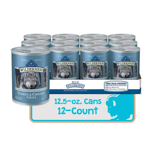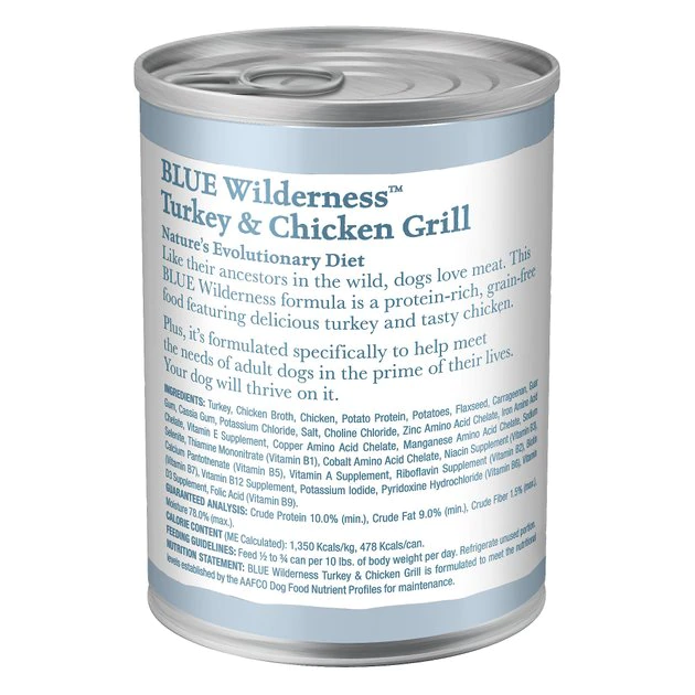 Pep up your dude’s dinner with something from the grill with Blue Buffalo Wilderness High Protein Grain Free, Natural Adult Wet Dog Food. Paw-fect for your adult amigo, this irresistibly tasty wet food is made using only the finest naturally grain and gluten-free ingredients. It starts with high-quality protein from grilled pieces of turkey and chicken, packed with fruits and veggies, then enhanced with vitamins and minerals. Formulated to promote an active lifestyle and healthy muscle growth, this high-protein dog food is made with wholesome ingredients that do not contain any grain, gluten, by-product meals, corn, wheat, soy, artificial flavors or preservatives.
