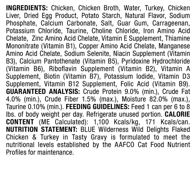 Keep your kitty companion feeling happy and healthy with Blue Buffalo Wilderness Wild Delights High Protein Grain Free, Natural Adult Flaked Wet Cat Food. Purr-fect for your adult amigo, this irresistibly tasty wet food is made using only the finest naturally grain and gluten-free ingredients. It starts with high-protein chicken and turkey, packed with healthy fruits and veggies, then enhanced with vitamins and minerals. Formulated to support the nutritional needs of adult cats, the exclusively wholesome ingredients do not contain any grain, gluten, by-product meals, corn, wheat, soy, artificial flavors or preservatives.