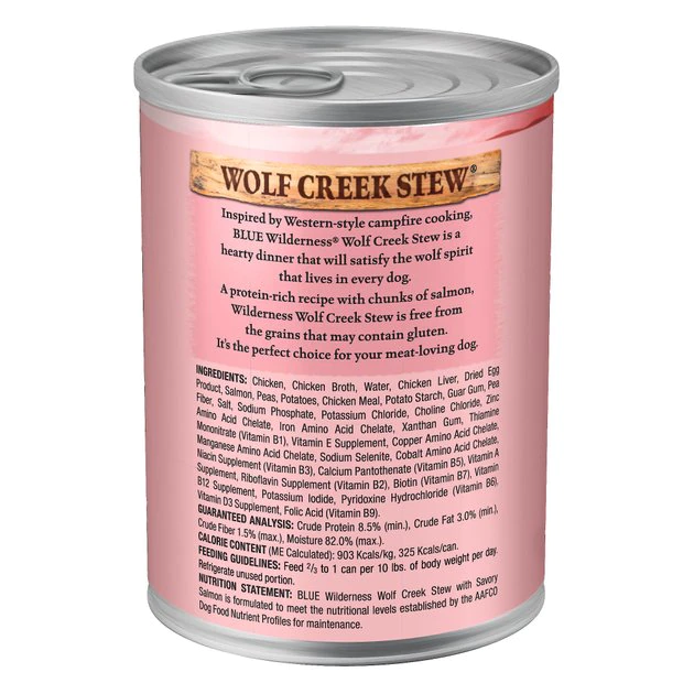 See your sidekick slam back some salmon with Blue Buffalo Wilderness Wolf Creek Stew High Protein Grain Free, Natural Wet Dog Food. Paw-fect for your doggie dude, this irresistibly tasty wet food is made using only the finest naturally grain and gluten-free ingredients. It starts with high-quality protein from tender chunks of salmon in a hearty gravy, packed with fruits and veggies, then enhanced with vitamins and minerals. Formulated to promote an active lifestyle and healthy muscle growth, this high-protein dog food is made with wholesome ingredients that do not contain any grain, gluten, by-product meals, corn, wheat, soy, artificial flavors or preservatives.