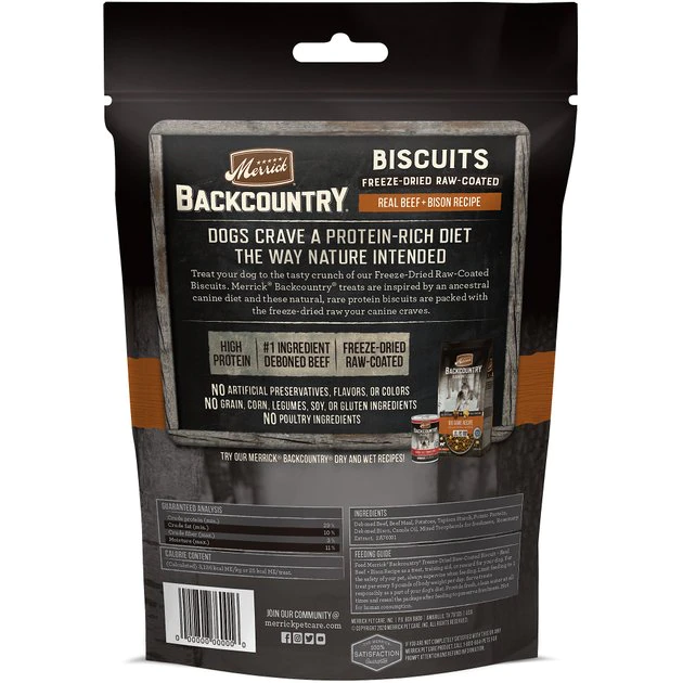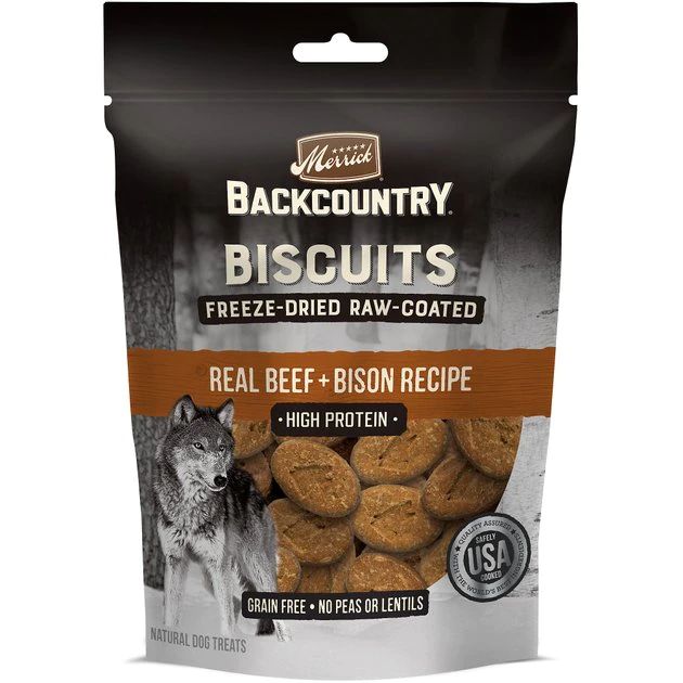 Indulge your canine’s instinctual craving for meat with Merrick Backcountry Beef + Bison Recipe Raw Coated Freeze-Dried Biscuit Dog Treats. Featuring a unique blend of real beef and bison, and crafted with deboned meat as the first ingredient, these high-protein treats have a delicious freeze-dried raw coating that adds a satisfying crunch. Better yet, these all-natural morsels are made in the USA and are free of corn, wheat, soy, peas, lentils and artificial ingredients. They’re perfect at home or on the go as a treat, training aid or reward for your trusty, meat-loving companion.
