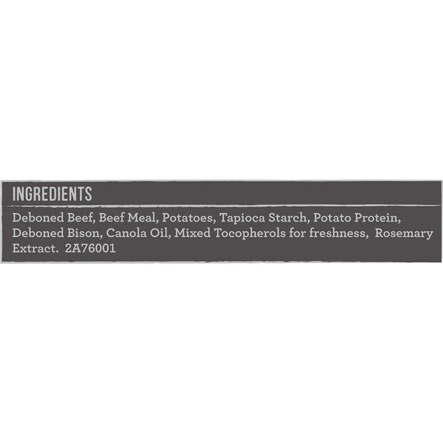 Deboned Beef, Beef Meal, Potatoes, Tapioca Starch, Potato Protein, Deboned Bison, Canola Oil, Mixed Tocopherols for freshness, Rosemary Extract.