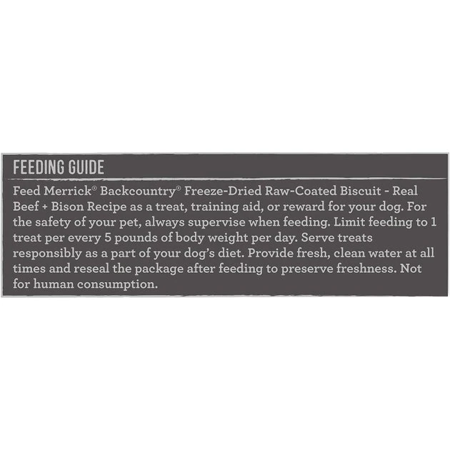 Feed Merrick Backcountry Freeze-Dried Raw Coated Real Beef + Bison Recipe as a treat, training aid, or reward for your dog. For the safety of your pet, always supervise when feeding. Limit feeding 1 treat per every 5 pounds of body weight per day. Serve treats responsibly as a part of your dog’s diet. Provide fresh, clean water at all times and reseal the package after feeding to preserve freshness. Not for human consumption.