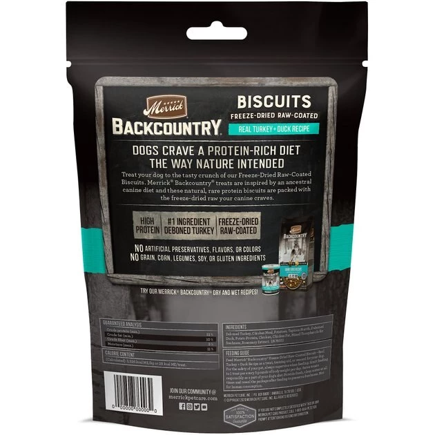 Indulge your canine companion’s instinctual craving for feathered game with Merrick Backcountry Turkey + Duck Recipe Raw Coated Freeze-Dried Biscuit Dog Treats. Featuring a unique blend of real turkey and duck, with deboned turkey as the first ingredient, these high-protein treats have a delicious freeze-dried raw coating that adds a satisfying crunch. Better yet, these all-natural morsels are made in the USA and are free of corn, wheat, soy, peas, lentils and artificial ingredients. They’re perfect as a treat, training aid or reward for your best pal.