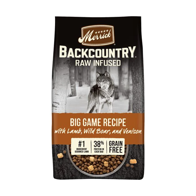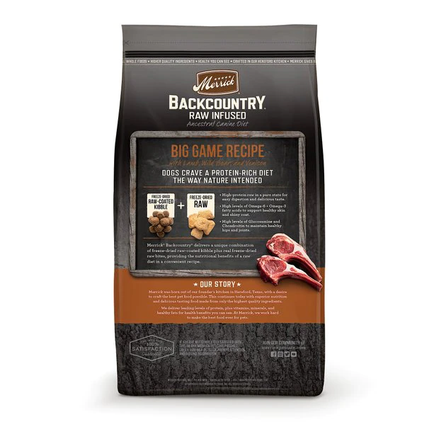 Feed your furry guy the nourishment he needs with Merrick Backcountry Raw Infused Grain Free Dry Dog Food Big Game Recipe. This freeze-dried dry food for dogs features real deboned beef as the very first ingredient. It’s combined with lamb and rabbit in a protein-rich and highly-digestible formula. This grain and gluten-free dry dog food contains freeze-dried raw-coated kibble and freeze-dried raw bites to give your buddy all the benefits of a raw diet. It’s developed with high levels of omega fatty acids to help promote healthy skin and a shiny coat while glucosamine and chondroitin support hip and joint function. It’s paw-fect for helping all breeds of adult dogs build healthy muscles and maintain a high level of energy throughout the day.