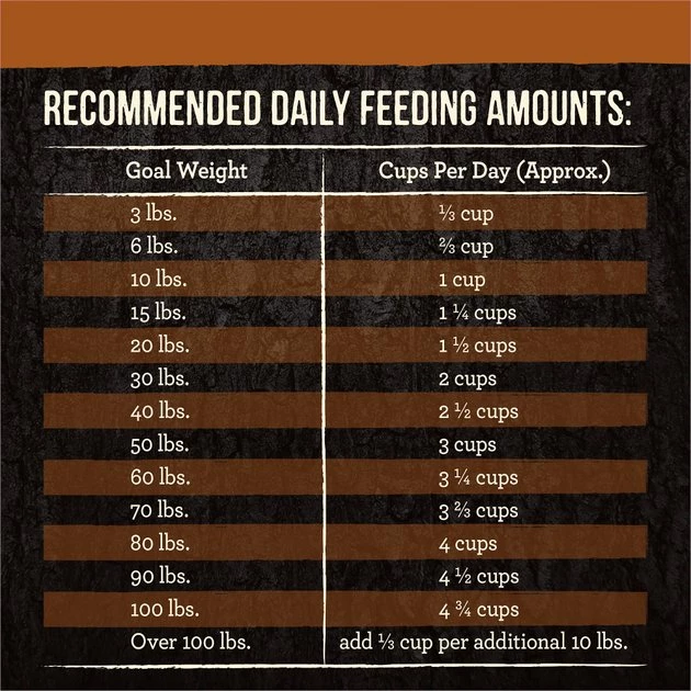 Divide the total per day by the total number of times you feed your dog per day to determine the portion size for each meal. Keep a clean bowl of fresh water available at all times. Every dog is a little different, so optimal feeding amounts may vary with age, size and activity level. Please use the information in the chart as an initial recommendation only and adjust when needed.