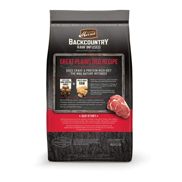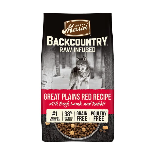 Give your pal a reason to wag his tail with Merrick Backcountry Raw Infused Grain Free Dry Dog Food Great Plains Red Recipe. This freeze-dried dry food for dogs features real deboned beef as the very first ingredient. It’s combined with lamb and rabbit in a protein-rich and highly-digestible poultry-free formula. This grain-free dry dog food contains freeze-dried raw-coated kibble and freeze-dried raw bites to give your buddy all the benefits of a raw diet. It’s developed with high levels of omega fatty acids to help promote healthy skin and a shiny coat while glucosamine and chondroitin support hip and joint function. It’s paw-fect for helping all breeds of adult dogs build healthy muscles and maintain a high level of energy throughout the day.