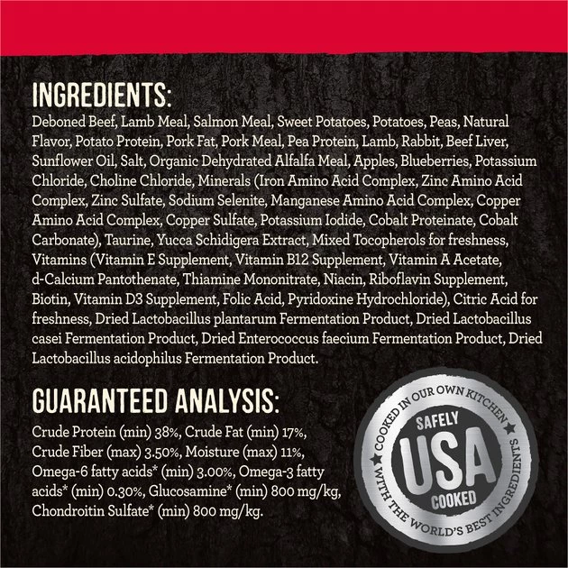 Deboned Beef, Lamb Meal, Salmon Meal, Sweet Potatoes, Potatoes, Peas, Natural Flavor, Potato Protein, Pork Fat, Pork Meal, Pea Protein, Lamb, Rabbit, Beef Liver, Sunflower Oil, Salt, Organic Dehydrated Alfalfa Meal, Apples, Blueberries, Potassium Chloride, Choline Chloride, Minerals (Iron Amino Acid Complex, Zinc Amino Acid Complex, Zinc Sulfate, Sodium Selenite, Manganese Amino Acid Complex, Copper Amino Acid Complex, Copper Sulfate, Potassium Iodide, Cobalt Proteinate, Cobalt Carbonate), Taurine, Yucca Schidigera Extract, Mixed Tocopherols for freshness, Vitamins (Vitamin E Supplement, Vitamin B12 Supplement, Vitamin A Acetate, d-Calcium Pantothenate, Thiamine Mononitrate, Niacin, Riboflavin Supplement, Biotin, Vitamin D3 Supplement, Folic Acid, Pyridoxine Hydrochloride), Citric Acid for freshness, Dried Lactobacillus plantarum Fermentation Product, Dried Lactobacillus casei Fermentation Product, Dried Enterococcus faecium Fermentation Product, Dried Lactobacillus acidophilus Fermentation Product.