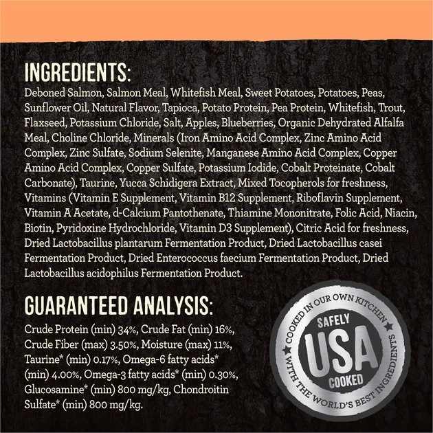 Deboned Salmon, Salmon Meal, Whitefish Meal, Sweet Potatoes, Potatoes, Peas, Sunflower Oil, Natural Flavor, Tapioca, Potato Protein, Pea Protein, Whitefish, Trout, Flaxseed, Potassium Chloride, Salt, Apples, Blueberries, Organic Dehydrated Alfalfa Meal, Choline Chloride, Minerals (Iron Amino Acid Complex, Zinc Amino Acid Complex, Zinc Sulfate, Sodium Selenite, Manganese Amino Acid Complex, Copper Amino Acid Complex, Copper Sulfate, Potassium Iodide, Cobalt Proteinate, Cobalt Carbonate), Taurine, Yucca Schidigera Extract, Mixed Tocopherols for freshness, Vitamins (Vitamin E Supplement, Vitamin B12 Supplement, Riboflavin Supplement, Vitamin A Acetate, d-Calcium Pantothenate, Thiamine Mononitrate, Folic Acid, Niacin, Biotin, Pyridoxine Hydrochloride, Vitamin D3 Supplement), Citric Acid for freshness, Dried Lactobacillus plantarum Fermentation Product, Dried Lactobacillus casei Fermentation Product, Dried Enterococcus faecium Fermentation Product, Dried Lactobacillus acidophilus Fermentation Product. 2B37070.