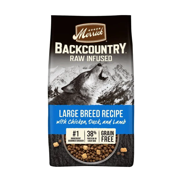 Keep your big ol’ buddy large and in charge with Merrick Backcountry Raw Infused Grain Free Dry Dog Food Large Breed Recipe. This freeze-dried dry food for dogs features real deboned chicken as the very first ingredient. It’s combined with duck and lamb into a protein-rich and highly-digestible formula. This grain and gluten-free dry dog food contains freeze-dried raw-coated kibble and freeze-dried raw bites to give your doggie dude all the benefits of a raw diet. It’s developed with high levels of omega fatty acids to help promote healthy skin and a shiny coat while glucosamine and chondroitin support hip and joint function. It’s paw-fect for helping large breeds of adult dogs build healthy muscles and maintain a high level of energy throughout the day.