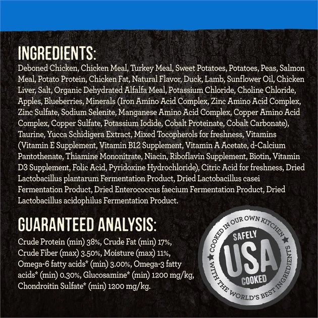Deboned Chicken, Chicken Meal, Turkey Meal, Sweet Potatoes, Potatoes, Peas, Salmon Meal, Potato Protein, Chicken Fat, Natural Flavor, Duck, Lamb, Sunflower Oil, Chicken Liver, Salt, Organic Dehydrated Alfalfa Meal, Potassium Chloride, Choline Chloride, Apples, Blueberries, Minerals (Iron Amino Acid Complex, Zinc Amino Acid Complex, Zinc Sulfate, Sodium Selenite, Manganese Amino Acid Complex, Copper Amino Acid Complex, Copper Sulfate, Potassium Iodide, Cobalt Proteinate, Cobalt Carbonate), Taurine, Yucca Schidigera Extract, Mixed Tocopherols for freshness, Vitamins (Vitamin E Supplement, Vitamin B12 Supplement, Vitamin A Acetate, d-Calcium Pantothenate, Thiamine Mononitrate, Niacin, Riboflavin Supplement, Biotin, Vitamin D3 Supplement, Folic Acid, Pyridoxine Hydrochloride), Citric Acid for freshness, Dried Lactobacillus plantarum Fermentation Product, Dried Lactobacillus casei Fermentation Product, Dried Enterococcus faecium Fermentation Product, Dried Lactobacillus acidophilus Fermentation Product.