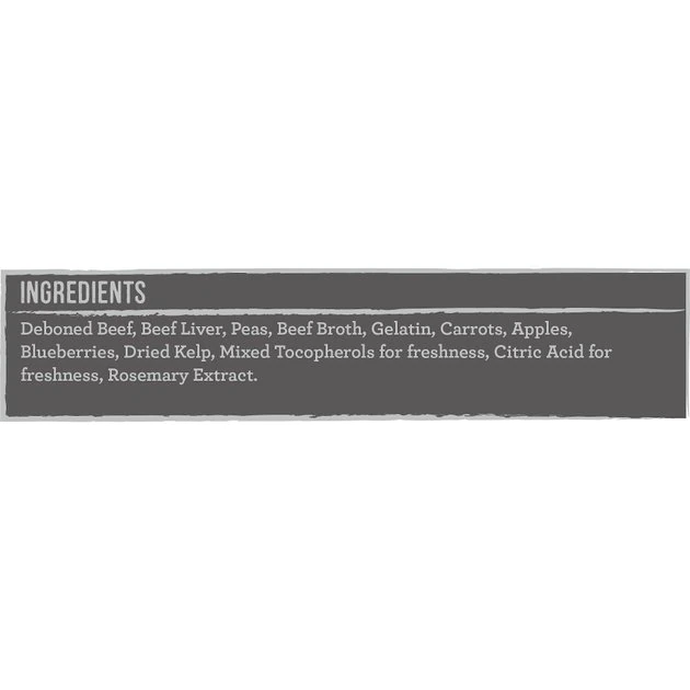 Deboned Beef, Beef Liver, Peas, Beef Broth, Gelatin, Carrots, Apples, Blueberries, Dried Kelp, Mixed Tocopherols for freshness, Citric Acid for freshness, Rosemary Extract.