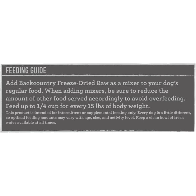 Add Backcountry Freeze-Dried Raw as a mixer to your dog’s regular food. When adding mixers, be sure to reduce the amount of other food served accordingly to avoid overfeeding.