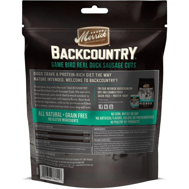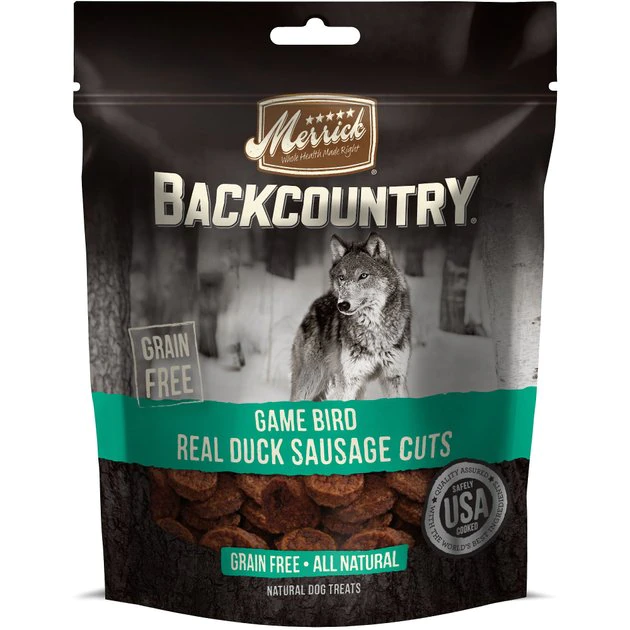 Merrick Backcountry Game Bird Real Duck Sausage Cuts Grain-Free Dog Treats feature a hearty, wood-smoked taste your four-legged friend will go wild for. These treats are grain-free with no gluten ingredients and start with real deboned duck as the first ingredient. Specially formulated to mimic the ancestral canine diet, these savory, all-natural morsels are packed with the meaty protein your canine companion craves. And like all Merrick recipes, these treats are cooked right here in the USA!