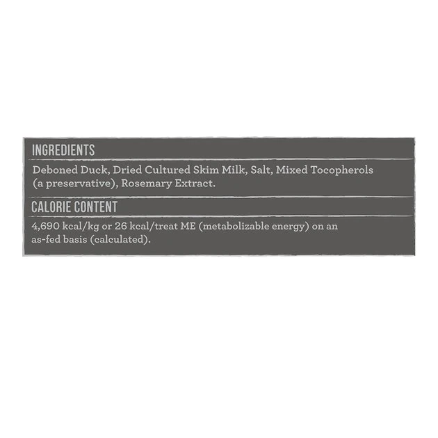 Deboned Duck, Dried Culured Skim Milk, Salt, Mixed Tocopherols (a preservative), Rosemary Extract.