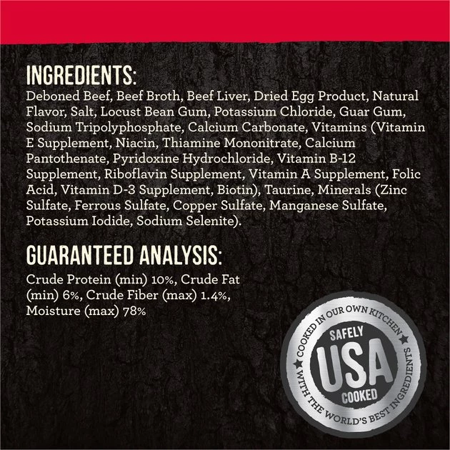 Deboned Beef, Beef Broth, Beef Liver, Dried Egg Product, Natural Flavor, Salt, Locust Bean Gum, Potassium Chloride, Guar Gum, Sodium Tripolyphosphate, Calcium Carbonate, Vitamins (Vitamin E Supplement, Niacin, Thiamine Mononitrate, Calcium Pantothenate, Pyridoxine Hydrochloride, Vitamin B-12 Supplement, Riboflavin Supplement, Vitamin A Supplement, Folic Acid, Vitamin D-3 Supplement, Biotin), Taurine, Minerals (Zinc Sulfate, Ferrous Sulfate, Copper Sulfate, Manganese Sulfate, Potassium Iodide, Sodium Selenite). 2B37002.