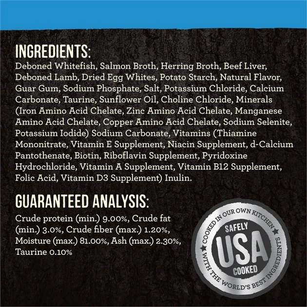 Deboned Whitefish, Salmon Broth, Herring Broth, Beef Liver, Deboned Lamb, Dried Egg Whites, Potato Starch, Natural Flavor, Guar Gum, Sodium Phosphate, Salt, Potassium Chloride, Calcium Carbonate, Taurine, Sunflower Oil, Choline Chloride, Minerals (Iron Amino Acid Chelate, Zinc Amino Acid Chelate, Manganese Amino Acid Chelate, Copper Amino Acid Chelate, Sodium Selenite, Potassium Iodide) Sodium Carbonate, Vitamins (Thiamine Mononitrate, Vitamin E Supplement, Niacin Supplement, d-Calcium Pantothenate, Biotin, Riboflavin Supplement, Pyridoxine Hydrochloride, Vitamin A Supplement, Vitamin B12 Supplement, Folic Acid, Vitamin D3 Supplement) Inulin.