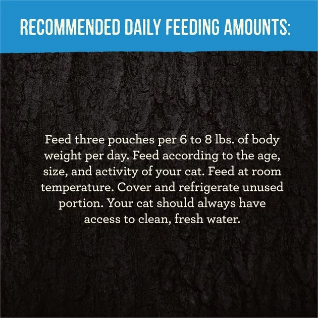 Serve at room temperature. Cover and refrigerate unused portion. Always provide access to clean, fresh water. Feed 3 pouches per 6 – 8 lbs Of body weight per day.