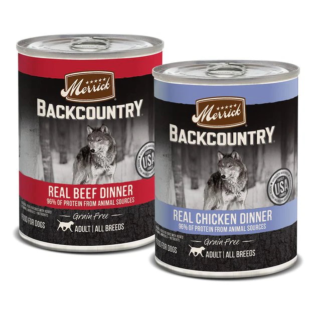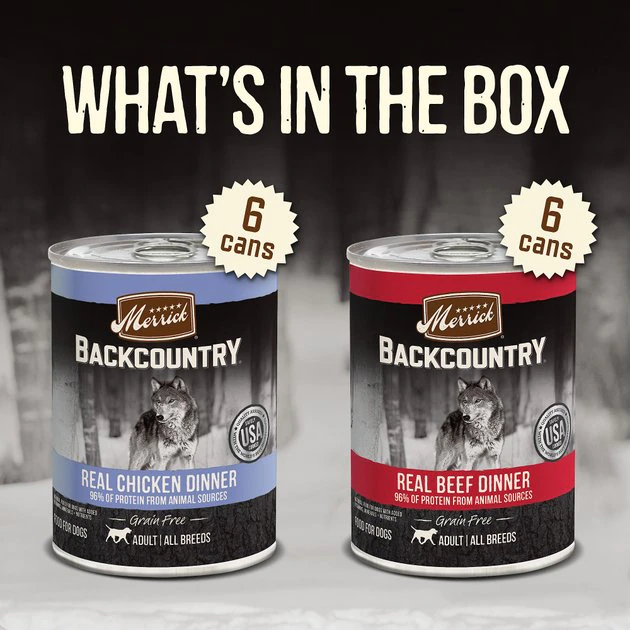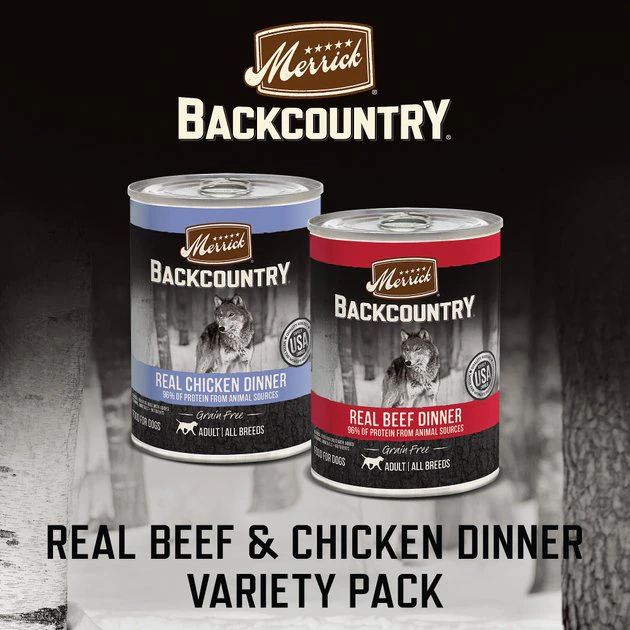 - Handy variety pack contains 6 cans of Backcountry Real Beef Dinner and 6 cans of Backcountry Real Chicken Dinner grain-free wet dog food.