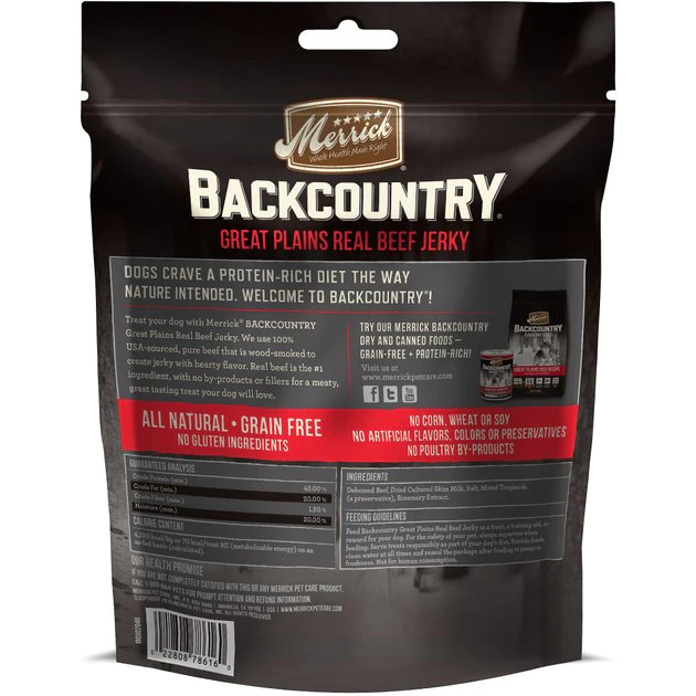 Merrick Backcountry Great Plain Real Beef Jerky Grain-Free Dog Treats feature a hearty, wood-smoked taste your four-legged friend will go wild for. These treats are grain-free with no gluten ingredients and start with real deboned beef as the first ingredient. Specially formulated to mimic the ancestral canine diet, these savory, all-natural morsels are packed with the meaty protein your canine companion craves. And like all Merrick recipes, these treats are cooked right here in the USA!