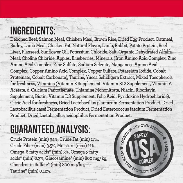 Deboned Beef, Salmon Meal, Chicken Meal, Brown Rice, Dried Egg Product, Oatmeal, Barley, Lamb Meal, Chicken Fat, Natural Flavor, Lamb, Rabbit, Potato Protein, Beef Liver, Flaxseed, Sunflower Oil, Potassium Chloride, Salt, Organic Dehydrated Alfalfa Meal, Choline Chloride, Apples, Blueberries, Minerals (Iron Amino Acid Complex, Zinc Amino Acid Complex, Zinc Sulfate, Sodium Selenite, Manganese Amino Acid Complex, Copper Amino Acid Complex, Copper Sulfate, Potassium Iodide, Cobalt Proteinate, Cobalt Carbonate), Taurine, Yucca Schidigera Extract, Mixed Tocopherols for freshness, Vitamins (Vitamin E Supplement, Vitamin B12 Supplement, Vitamin A Acetate, d-Calcium Pantothenate, Thiamine Mononitrate, Niacin, Riboflavin Supplement, Biotin, Vitamin D3 Supplement, Folic Acid, Pyridoxine Hydrochloride), Citric Acid for freshness, Dried Lactobacillus plantarum Fermentation Product, Dried Lactobacillus casei Fermentation Product, Dried Enterococcus faecium Fermentation Product, Dried Lactobacillus acidophilus Fermentation Product.