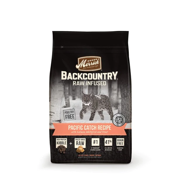 Feed your feline an ancestral diet packed with the protein she craves with Merrick Backcountry Raw Infused Pacific Catch Recipe Grain-Free Dry Cat Food. This grain-free recipe starts with real, deboned salmon and features freeze-dried raw protein pieces in a pure state to provide nutritional boost with easy digestion and a fresh taste. The raw inclusion goes through rigorous testing and a process called High-Pressure Processing (HPP) to ensure food safety. This whitefish and salmon kibble delivers the high-quality protein your cat needs to help her build and maintain healthy muscle tissue and energy levels. Glucosamine and chondroitin in this adult cat food support healthy hips and joints, while omega fatty acids promote skin and coat health. Not only will you paw-tner get the nutritional benefits of a raw diet they would have discovered in the wild, but she’ll also get to enjoy a meal that’s completely free from corn, wheat and gluten! And just like all Merrick cat food recipes, this one is crafted in Merrick’s Hereford, TX kitchen and cooked in the USA, in facilities that uphold strict FDA guidelines.