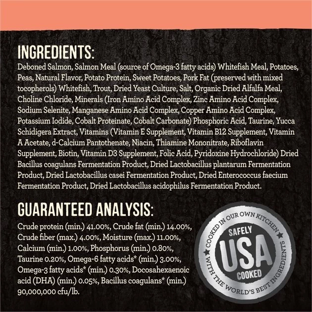 Deboned Salmon, Salmon Meal (Source of Omega-3 Fatty Acids), Whitefish Meal, Potatoes, Peas, Natural Flavor, Potato Protein, Sweet Potatoes, Pork Fat (Preserved with Mixed Tocopherols), Whitefish, Trout, Dried Yeast Culture, Salt, Organic Dried Alfalfa Meal, Choline Chloride, Minerals (Iron Amino Acid Complex, Zinc Amino Acid Complex, Sodium Selenite, Manganese Amino Acid Complex, Copper Amino Acid Complex, Potassium Iodide, Cobalt Proteinate, Cobalt Carbonate), Phosphoric Acid, Taurine, Yucca Schidigera Extract, Vitamins (Vitamin E Supplement, Vitamin B12 Supplement, Vitamin A Acetate, D-Calcium Pantothenate, Niacin, Thiamine Mononitrate, Riboflavin Supplement, Biotin, Vitamin D3 Supplement, Folic Acid, Pyridoxine Hydrochloride), Dried Bacillus Coagulans Fermentation Product, Dried Lactobacillus Plantarum Fermentation Product, Dried Lactobacillus Casei Fermentation Product, Dried Enterococcus Faecium Fermentation Product, Dried Lactobacillus Acidophilus Fermentation Product.