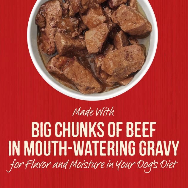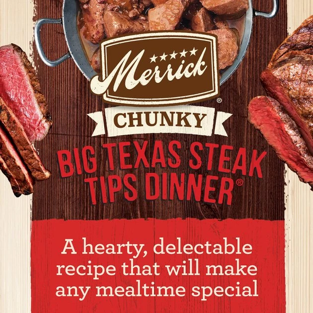 See your sidekick sink his teeth into big bites of beef with Merrick Chunky Grain Free Wet Dog Food Big Texas Steak Tips Dinner. This wholesome grain-free wet food for dogs features chunks of USDA-inspected deboned beef in a wag-worthy gravy and does not contain any artificial colors, flavors, preservatives or by-products. This delicious recipe is crafted in Merrickโs Hereford, Texas kitchen and cooked in the USA for adult dogs. You can feed it as a stand-alone meal or added it to dry food as a tasty topper.