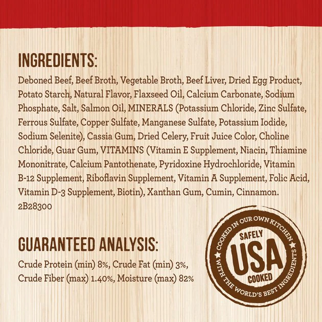 Deboned Beef, Beef Broth, Vegetable Broth, Beef Liver, Dried Egg Product, Potato Starch, Natural Flavor, Flaxseed Oil, Calcium Carbonate, Sodium Phosphate, Salt, Salmon Oil, Minerals (Potassium Chloride, Zinc Sulfate, Ferrous Sulfate, Copper Sulfate, Manganese Sulfate, Potassium Iodide, Sodium Selenite), Cassia Gum, Dried Celery, Fruit Juice Color, Choline Chloride, Guar Gum, Vitamins (Vitamin E Supplement, Niacin, Thiamine Mononitrate, Calcium Pantothenate, Pyridoxine Hydrochloride, Vitamin B-12 Supplement, Riboflavin Supplement, Vitamin A Supplement, Folic Acid, Vitamin D-3 Supplement, Biotin), Xanthan Gum, Cumin, Cinnamon.