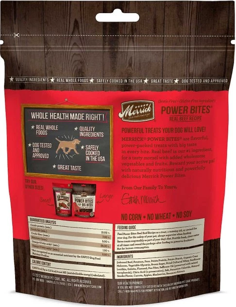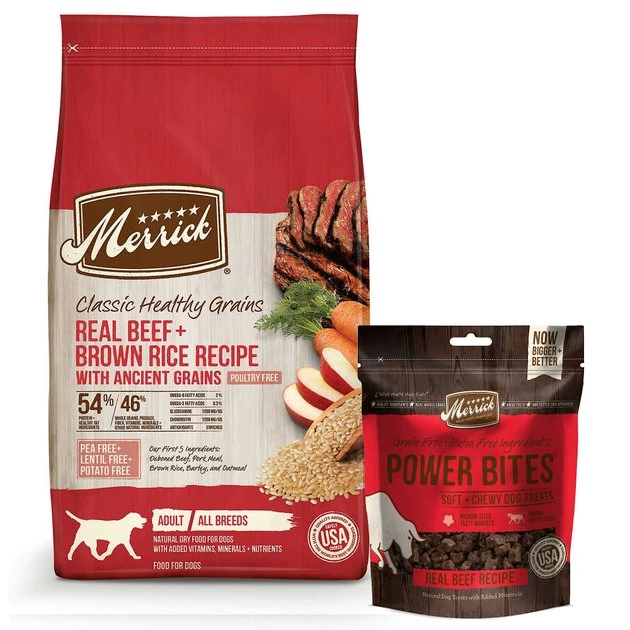 Merrick Classic Healthy Grains Real Beef + Brown Rice Recipe with Ancient Grains Adult Dry Food includes essential vitamins, minerals, brown rice and ancient grains such as quinoa to aid in digestion. Power Bites Real Texas Beef Recipe Grain-Free Soft & Chewy Dog Treats are grain-free and gluten-free for food-sensitive pets.