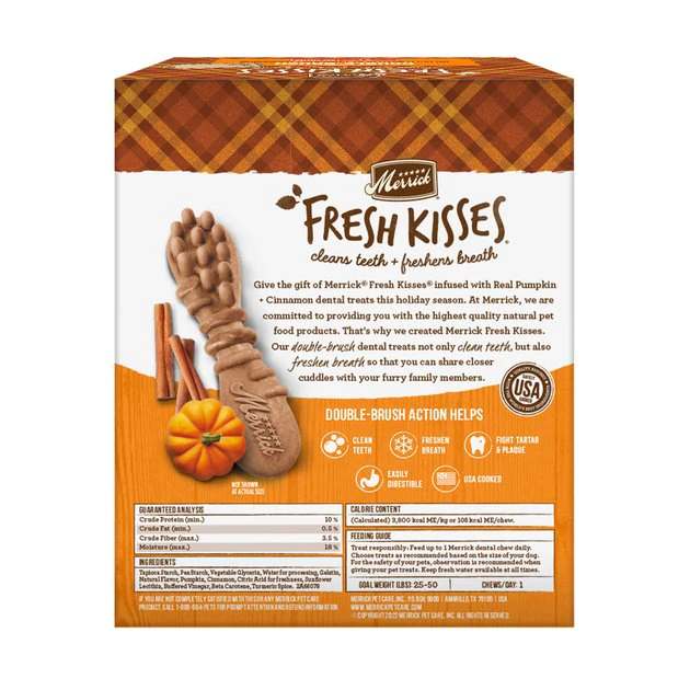 Your furry friend will love Merrick Fresh Kisses Real Pumpkin & Cinnamon Medium Breed Dog Dental Treats! With these scrumptious all-natural goodies, you can help your medium breed dog achieve cleaner teeth and fresher breath, all while experiencing a whisker-licking seasonal flavor. They are soft enough to effectively clean plaque and tartar from your pup’s pearly whites while he chews, yet tough enough to last for a satisfying chewing session! The double-brush design cleans teeth, real pumpkin freshens your dog’s breath as he chews and with only 13 ingredients, these limited-edition dental chews make the paw-fect reward, especially around the howl-idays! And you can feel extra good knowing that they are made without gluten, grains or potatoes.