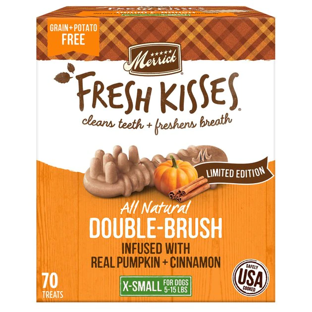 Your furry friend will love Merrick Fresh Kisses Real Pumpkin & Cinnamon Toy Breed Dog Dental Treats! With these scrumptious all-natural goodies, you can help your toy breed dog achieve cleaner teeth and fresher breath, all while experiencing a whisker-licking seasonal flavor. They are soft enough to effectively clean plaque and tartar from your pup’s pearly whites while he chews, yet tough enough to last for a satisfying chewing session! The double-brush design cleans teeth, real pumpkin freshens your dog’s breath as he chews and with only 13 ingredients, these limited-edition dental chews make the paw-fect reward, especially around the howl-idays! And you can feel extra good knowing that they are made without gluten, grains or potatoes.