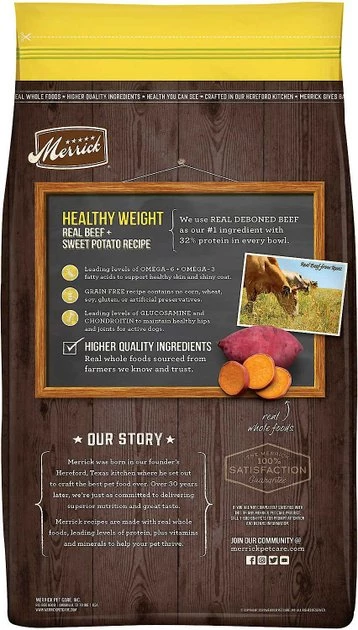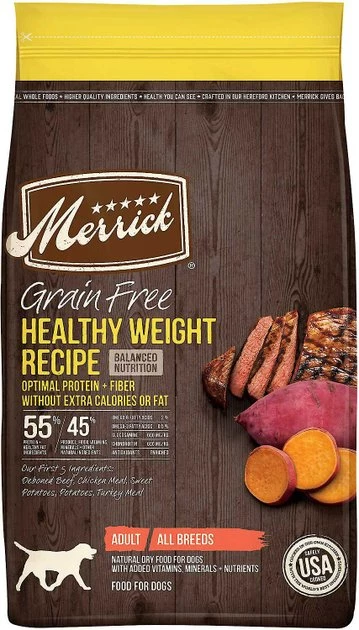 Reward your canine companion for her good behavior and feed her a kibble recipe that will help her maintain a healthy weight with Merrick Grain-Free Dry Food Healthy Weight Recipe + Power Bites Real Texas Beef Recipe Grain-Free Soft & Chewy Dog Treats. Merrick Grain-Free Dry Food Healthy Weight Recipe contains 55% protein and healthy fat ingredients to help maintain optimal weight and increased energy, along with 45% produce, fiber, vitamins, minerals and other natural ingredients. The Power Bites Real Texas Beef Recipe Grain-Free Soft & Chewy Dog Treats are all-natural, soft and chewy treats with big taste and industry-leading levels of protein packed into every bite. They start with real deboned meat as the #1 ingredient, with added nutrition from fresh fruits and vegetables. Perfect for rewarding or training, your dog is sure to love Power Bites!