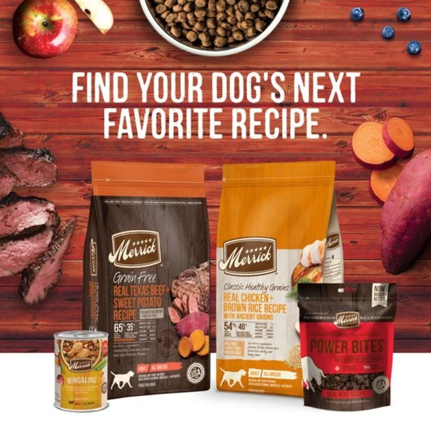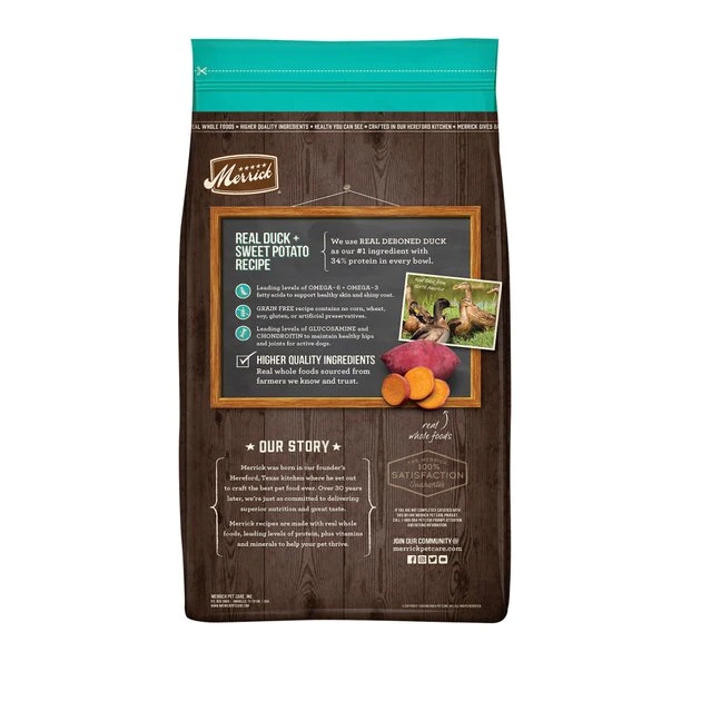 Feed your furry friend the wholesome goodness of Merrick Grain-Free Duck + Sweet Potato Recipe Dry Dog Food. This recipe is made with 65% protein and healthy fat, with deboned duck as the very first ingredient to promote healthy muscle tissue and energy levels. The remaining 35% includes produce, fiber, vitamins, minerals and other natural ingredients to create a complete and balanced diet that’s paw-fect for adult dogs of all breeds. This grain- and gluten-free dry dog food is developed with high levels of omega fatty acids to help promote healthy skin and a shiny coat, while glucosamine and chondroitin support hip and joint function. This kibble is cooked in the USA in Merrick’s Hereford, TX kitchen with high-quality whole foods sourced from trusted farmers and is made without any corn, wheat, soy, gluten or artificial preservatives.