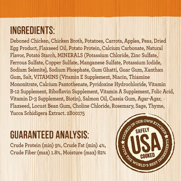 Deboned Chicken, Chicken Broth, Potatoes, Carrots, Apples, Peas, Dried Egg Product, Flaxseed Oil, Potato Protein, Calcium Carbonate, Natural Flavor, Potato Starch, Minerals (Potassium Chloride, Zinc Sulfate, Ferrous Sulfate, Copper Sulfate, Manganese Sulfate, Potassium Iodide, Sodium Selenite), Sodium Phosphate, Gum Ghatti, Guar Gum, Xanthan Gum, Salt, Vitamins (Vitamin E Supplement, Niacin, Thiamine Mononitrate, Calcium Pantothenate, Pyridoxine Hydrochloride, Vitamin B-12 Supplement, Riboflavin Supplement, Vitamin A Supplement, Folic Acid, Vitamin D-3 Supplement, Biotin), Salmon Oil, Cassia Gum, Agar-Agar, Flaxseed, Locust Bean Gum, Choline Chloride, Rosemary, Sage, Thyme, Yucca Schidigera Extract.