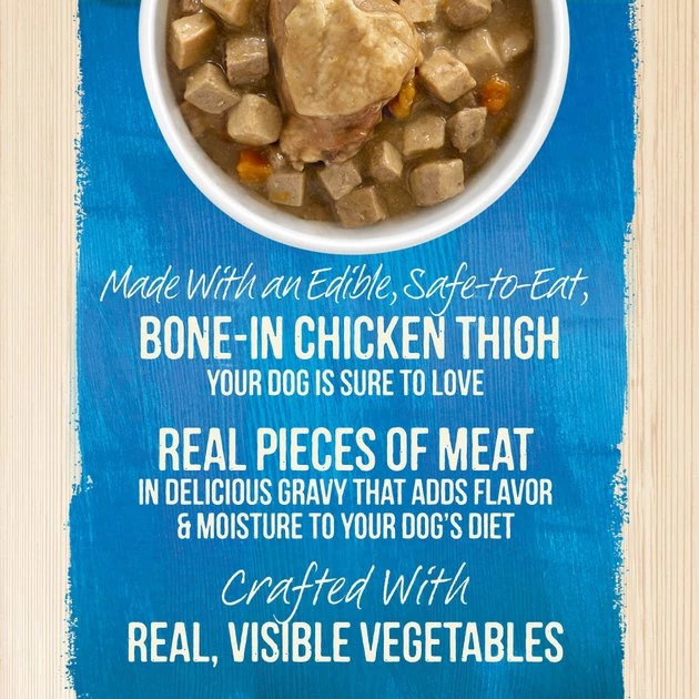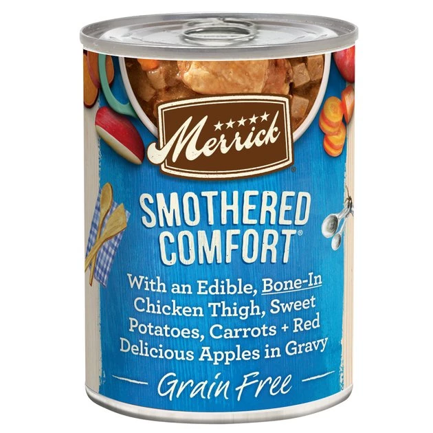 Give your doggie some wag-worthy comfort food with Merrick Grain-Free Wet Dog Food Smothered Comfort. This natural grain-free wet dog food features real USDA-inspected bone-in chicken thighs as the very first ingredient. They are marinated and slow-cooked on a softened bone, making it safe for your pup to enjoy. This recipe also contains other natural ingredients, including carrots, sweet potatoes and red delicious apples in a savory gravy made with chicken broth, adding even more flavor and moisture to your dog’s meal. And you can feel good knowing that this recipe is made in Merrick’s Hereford, Texas kitchen without any artificial colors, flavors, preservatives or by-products. This delicious grain-free wet dog food can be given as a standalone meal or added to dry food as a tasty topper. Simply pull the easy-open tab on the can and serve!